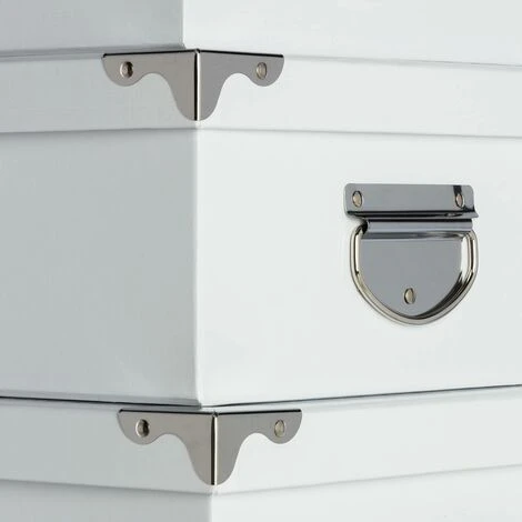 Set di 6 scatole angoli in metallo bianco, cartone, dimensioni 1) L. 28 X l. 19,5 X H. 10,8 cm 2) L. 32 X l. 21,5 X H. 11,8 cm 3) L. 36 X l. 24,5 X H. 12,5 cm 4) L. 40 X l. 26,5 X H. 13,8 cm 5) L. 44 X l. 31 X 15 cm 6) L. 48 X l. 33,5 X H. 16 cm