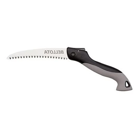 Pieghevole. Chiusura a pulsante. Lama curva e conica e denti temprati ad impulso. Manico in bimateriale che consente il massimo adattamento alla mano ed evita scivolamenti.
