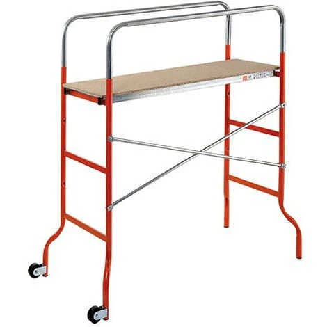 Struttura tubolare in acciaio verniciato, dotato di pianale di calpestio in legno multistrato e di due ruote. Completamente smontabile. Peso kg. 15,8. Portata Kg 120. Altezza massima di lavoro cm. 306. Dimensioni cm. 144 x 62 x H.142. Made in Italy.